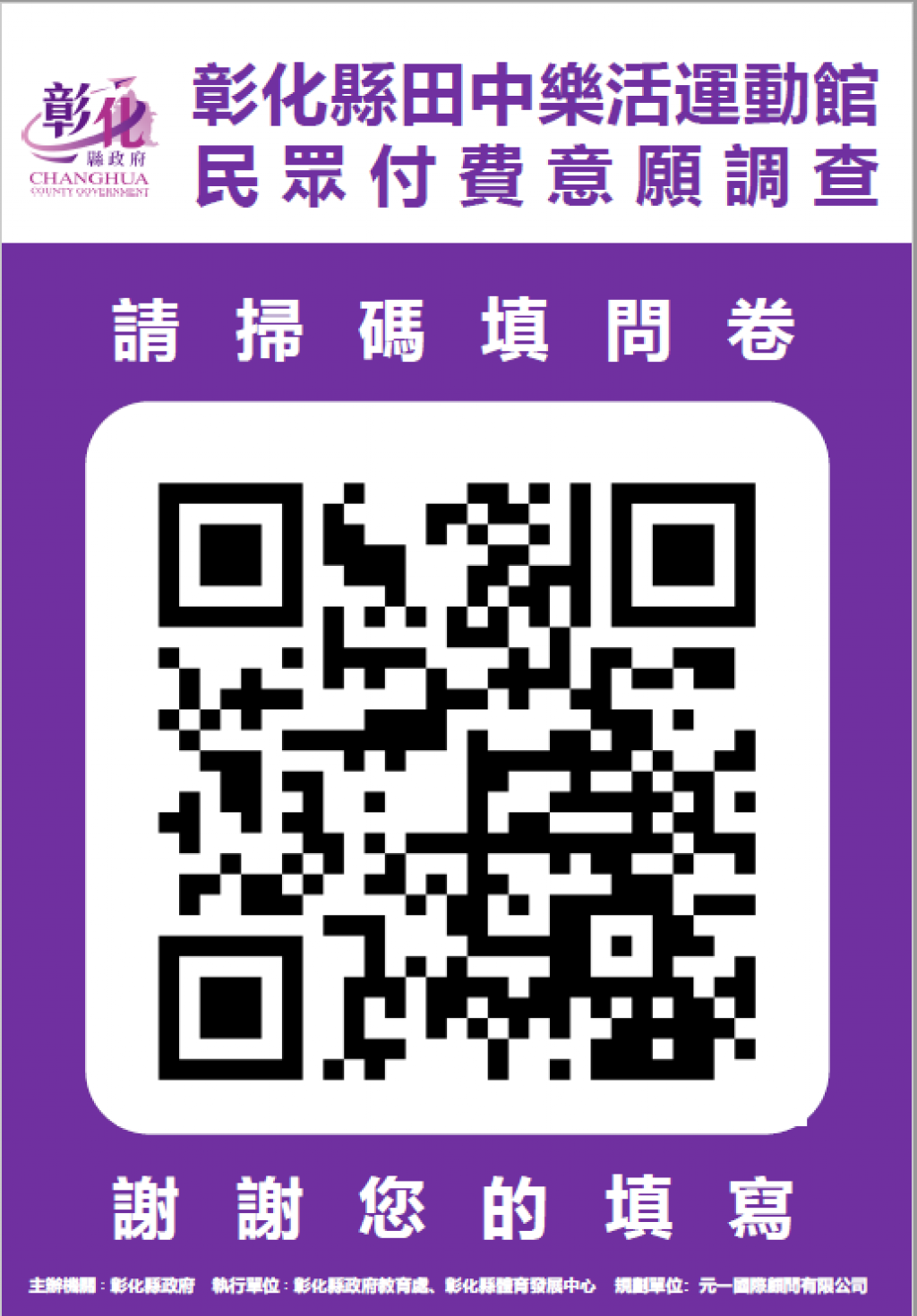 彰化縣政府為辦理「彰化縣田中樂活運動館」可行性評估作業,敬請民眾踴躍填答運動需求及付費意願調查問卷。
