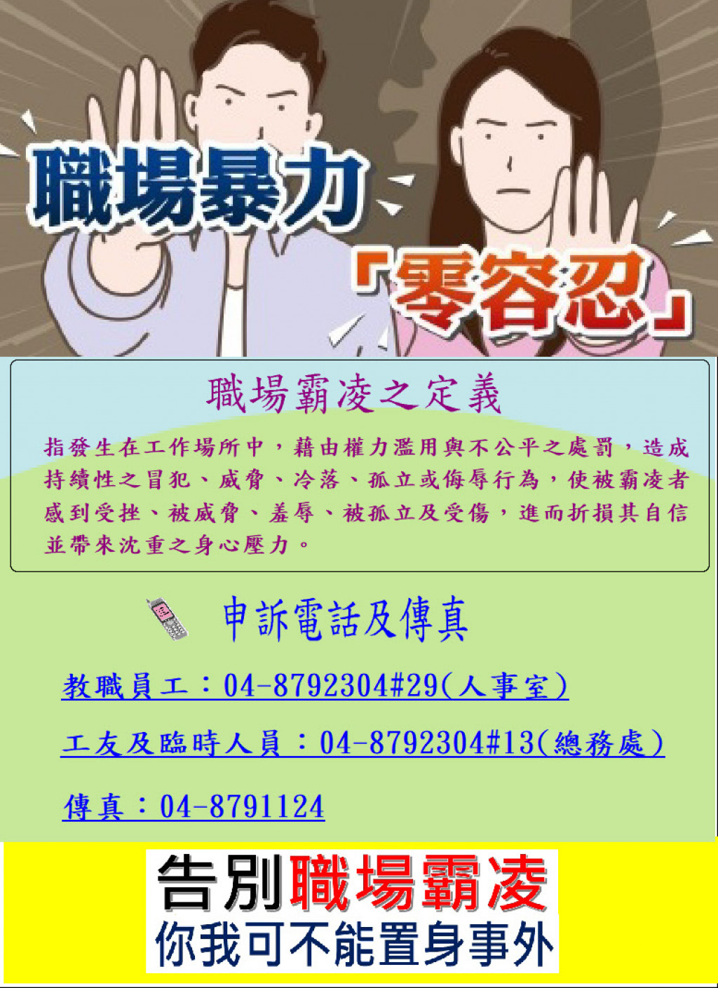 職場霸凌防治宣導影片 https://shorturl.at/ubLOD 職場霸凌:指發生在工作場所中,藉由權力濫用與不公平之處罰,造成持續性之冒犯、威脅、冷落、孤立或侮辱行為,使被霸凌者感到受挫、被威脅、羞辱、被孤立及受傷,進而折損其自信並帶來沈重之身心壓力。 職場暴力零容忍 告別職場霸凌 你我不可置身事外